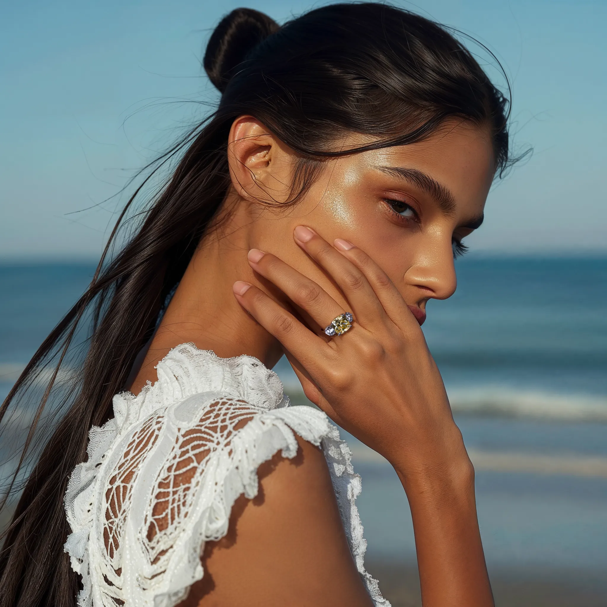 - A stunning yellow sapphire sits at the center, flanked by two sparkling diamonds on a silver band. A radiant design symbolizing joy and prosperity.