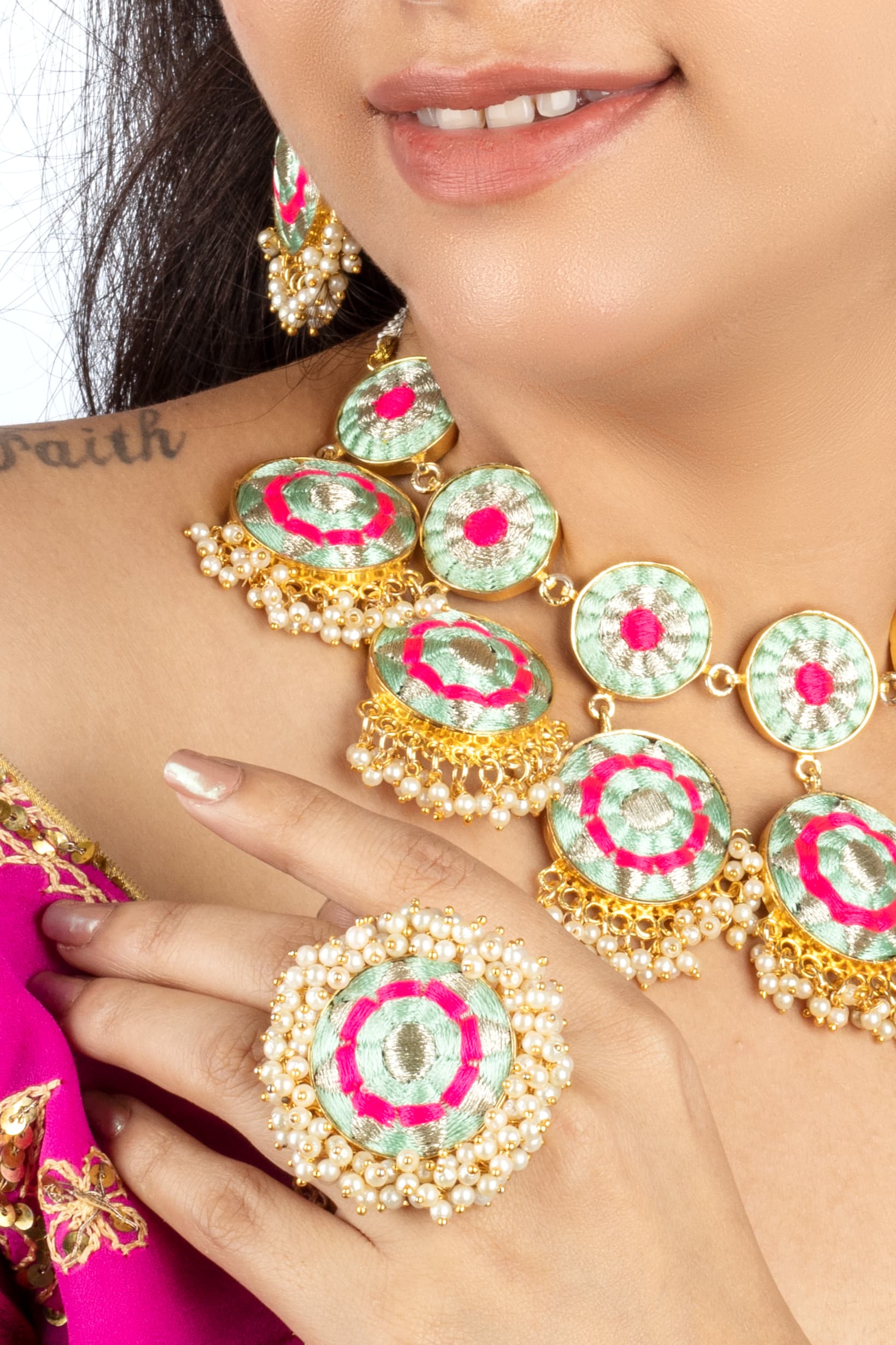 - Design Inspiration : Our collection is inspired by the vibrant beauty of Indian wedding celebrations — from the sunlit joy of Haldi to the rich traditions of Mehndi and the musical spirit of Sangeet. Each piece is handwoven using silk threads and set on brass, blending heritage craftsmanship with contemporary aesthetics. The color palette — a thoughtful mix of hot pink, mustard yellow and soft pastels — reflects the joyful energy, floral décor, and elegance of festive Indian occasions. Drawing from traditional motifs like marigolds, paisleys, and mandalas, and reinterpreting them in modern silhouettes, our jewelry is designed to be both statement-worthy and lightweight, making it perfect for pre-wedding events and gifting. Rooted in tradition, yet created for the modern celebration, our embroidered jewelry offers a one-of-a-kind wearable art experience — joyful, handcrafted, and full of meaning.